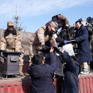12月21日,陆军第76集团军某旅官兵在积石山县石塬镇安置点与受灾群众一起卸载取暖炉。