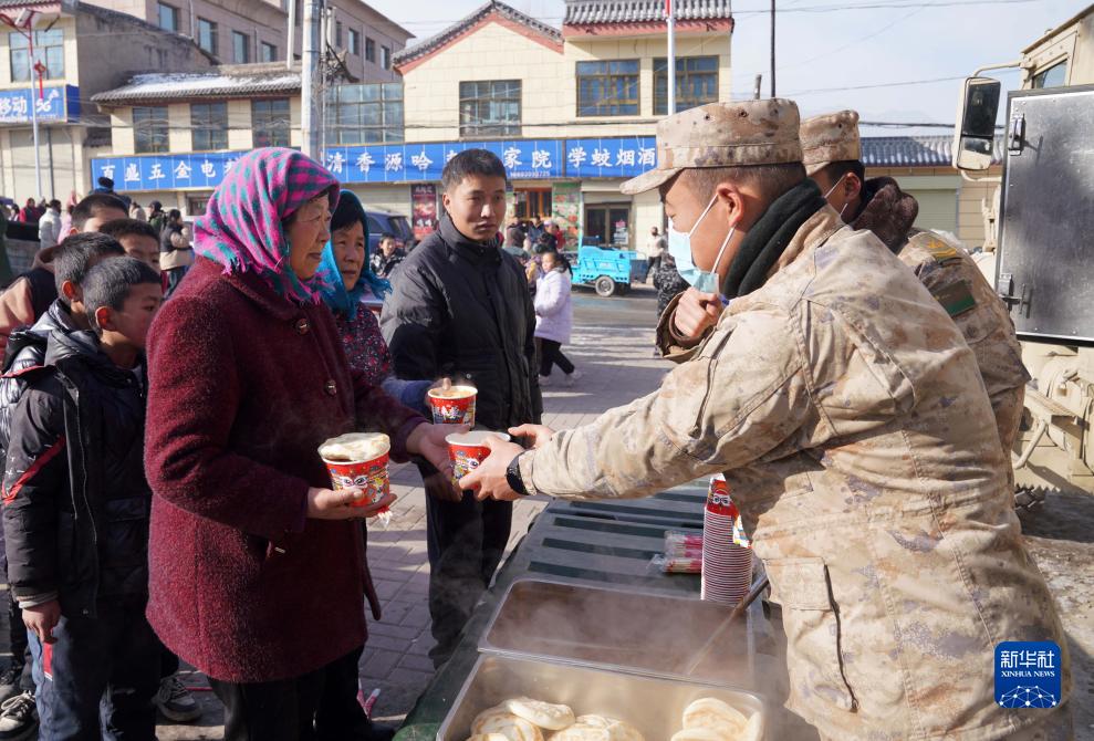 12日21日,在积石山县刘集乡,陆军第76集团军某旅官兵为受灾群众提供热饭。