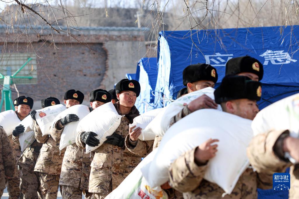 12月21日,武警甘肃总队临夏支队官兵在积石山县刘集乡阳屲村为受灾群众搬运面粉。