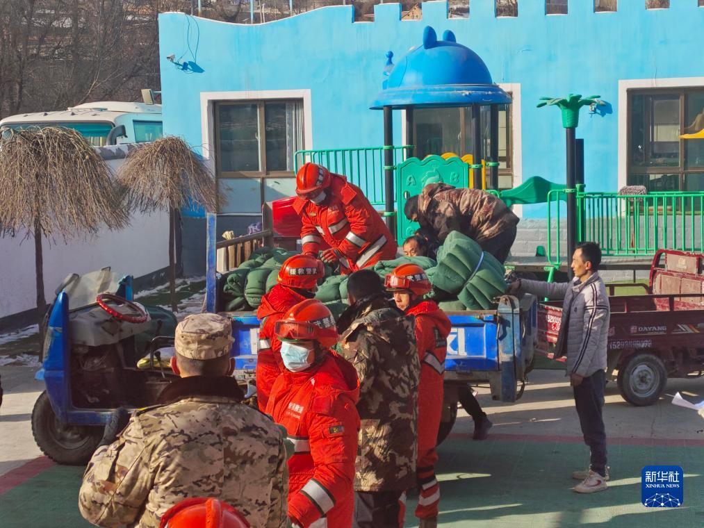 12月21日,武警甘肃总队机动支队官兵在积石山县刘集乡崔家村帮助工作人员为灾区群众分发被褥。