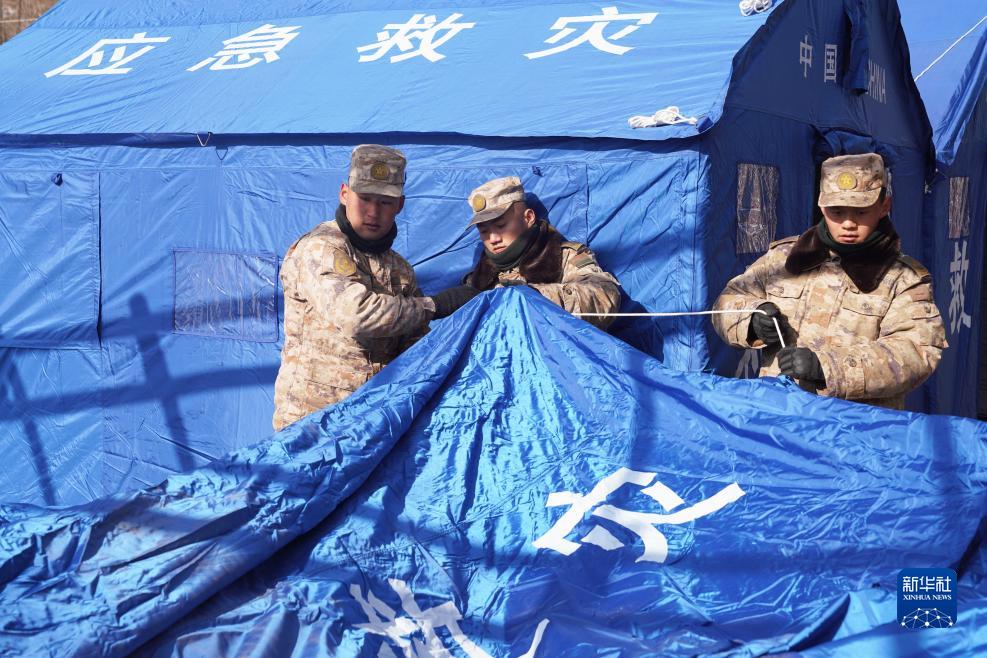 12月21日,陆军第76集团军某旅官兵在积石山县石塬镇为受灾群众搭建帐篷。