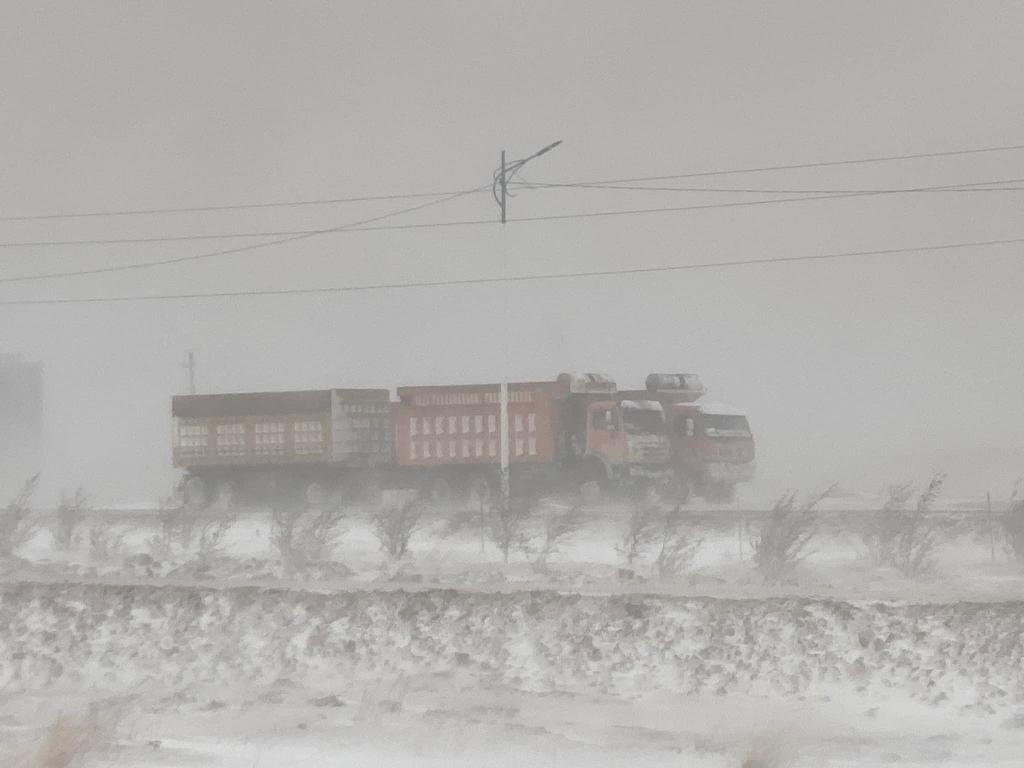 5月20日,在蒙古国苏赫巴托尔省,货车在暴风雪中行驶。新华社发(蒙古国苏赫巴托尔省BBS电视台供图)