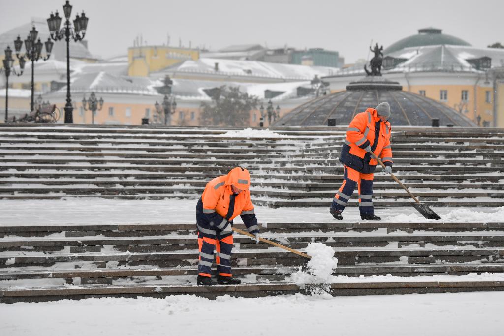2023年10月27日,在俄罗斯首都莫斯科,工人清理台阶上的积雪。新华社发(亚历山大摄)
