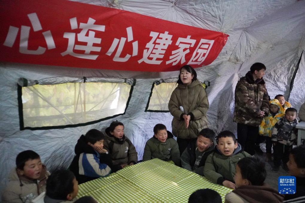 当日,位于甘肃省临夏州积石山县大河家镇康吊村安置点的“帐篷小课堂”正式启用。在“帐篷小课堂”里,康吊小学的老师带着孩子们唱歌、朗诵、看电影等,帮助小朋友尽快恢复校园集体生活。