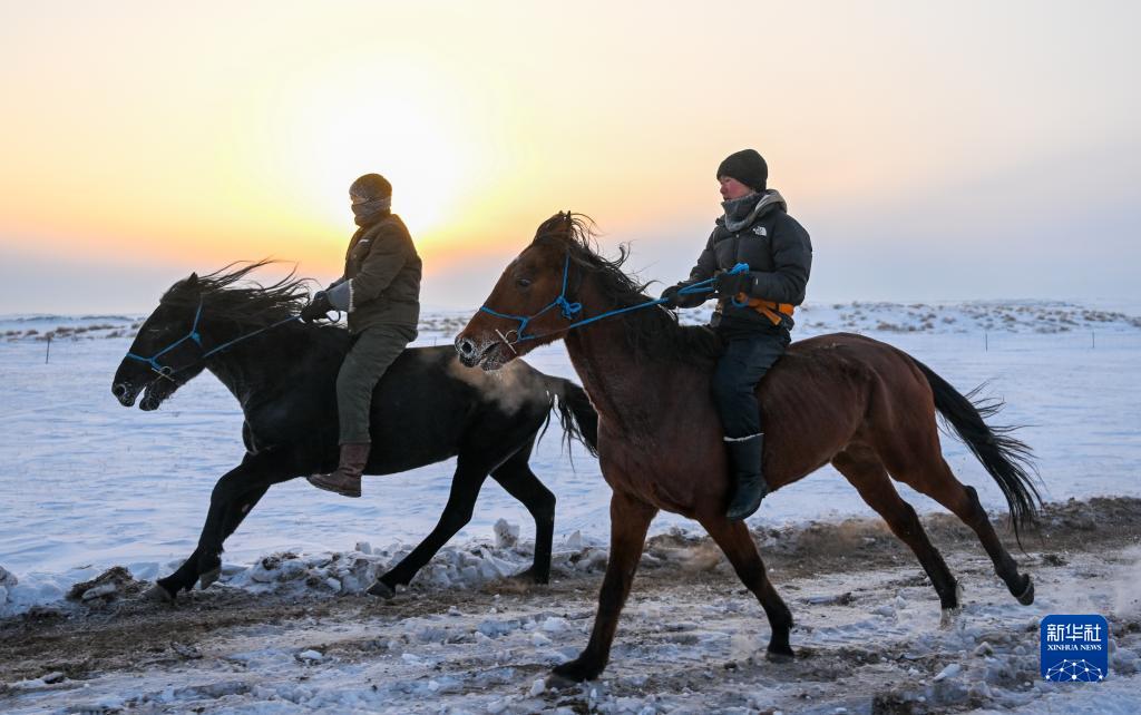 12月15日,乃日嘎(右)和伊吉力在草原上骑马训练。
