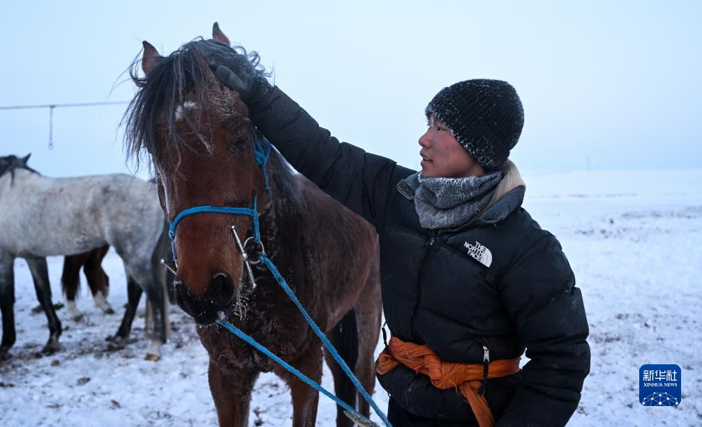 12月15日,乃日嘎在训练结束后抚摸马匹。