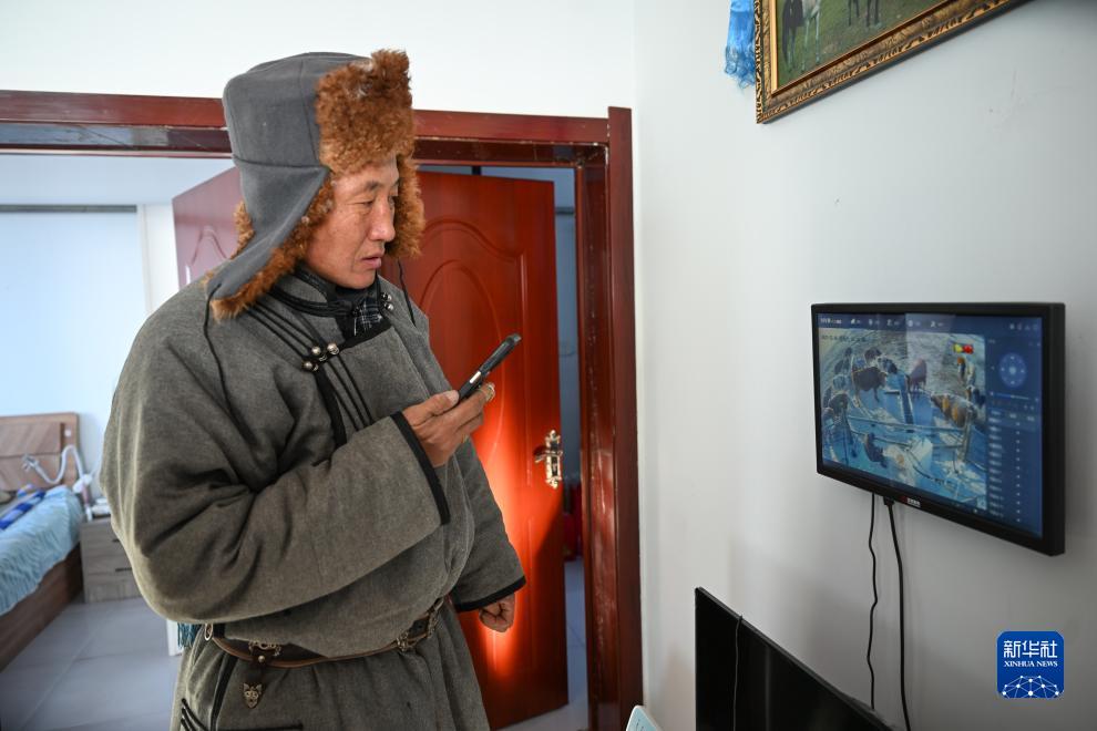 12月16日,额尔敦达来在家中通过监控查看牲畜情况。