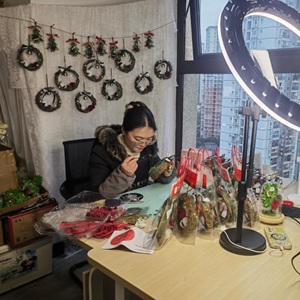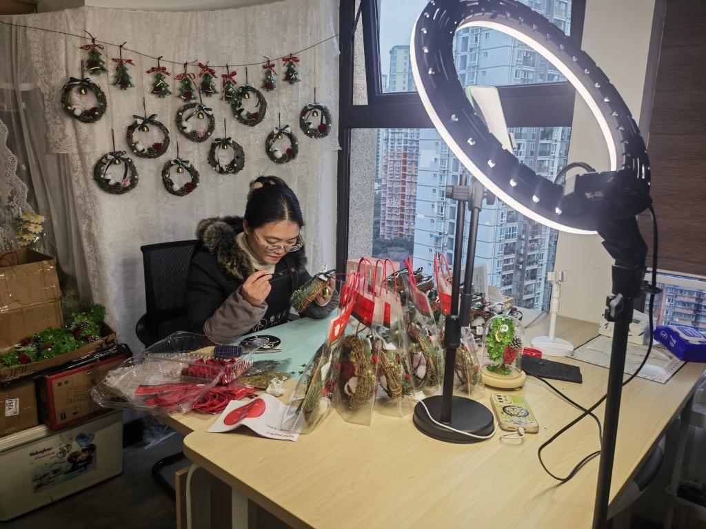 汪林的员工正在直播制作花艺产品。新华社记者吴燕霞 摄
