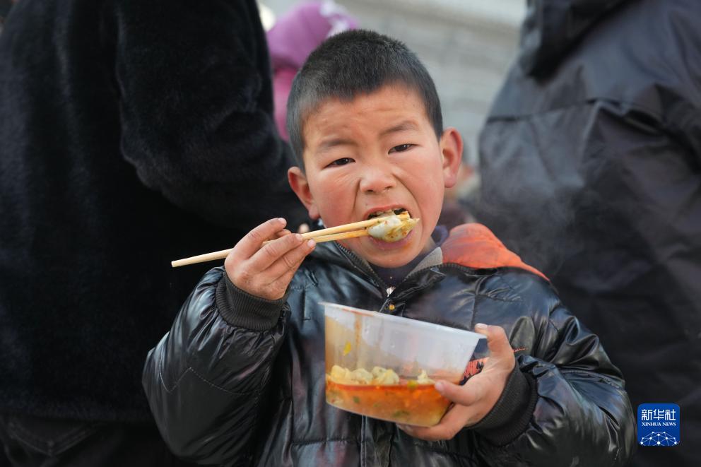 12月22日,在积石山县大河家镇梅坡村活动板房安置点,小朋友在吃饺子。