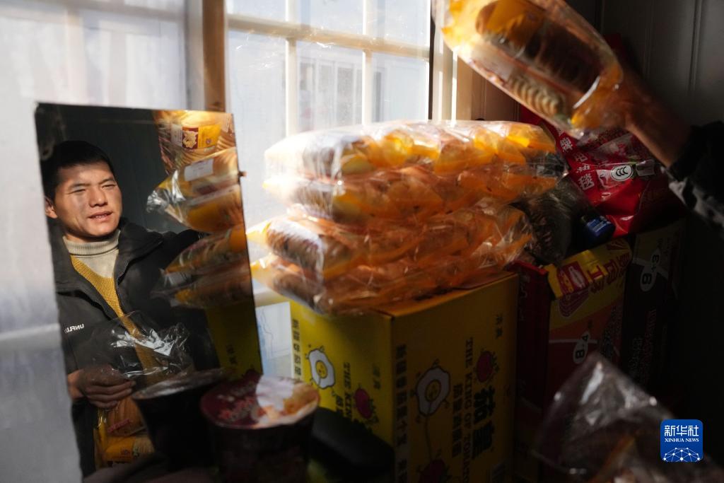 12月22日,在积石山县大河家镇梅坡村活动板房安置点,受灾村民马雄在整理生活物资。