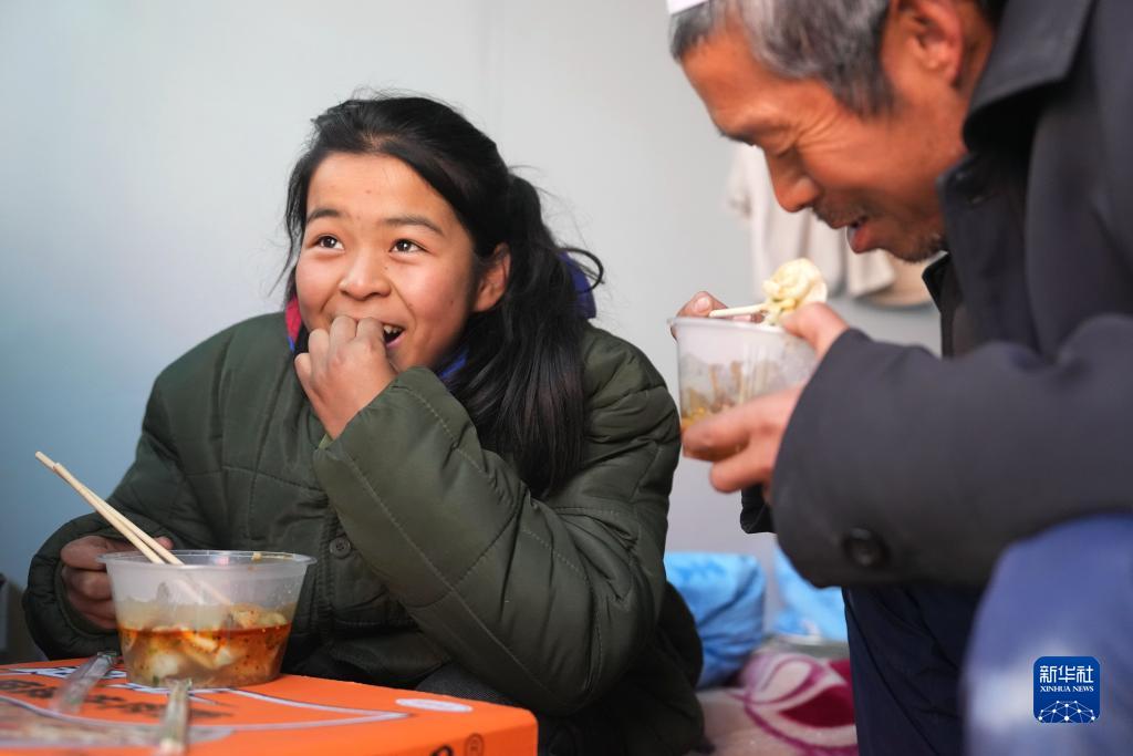 12月22日,在积石山县大河家镇梅坡村活动板房安置点,受灾村民马小梅(左)和爸爸一起吃饺子。