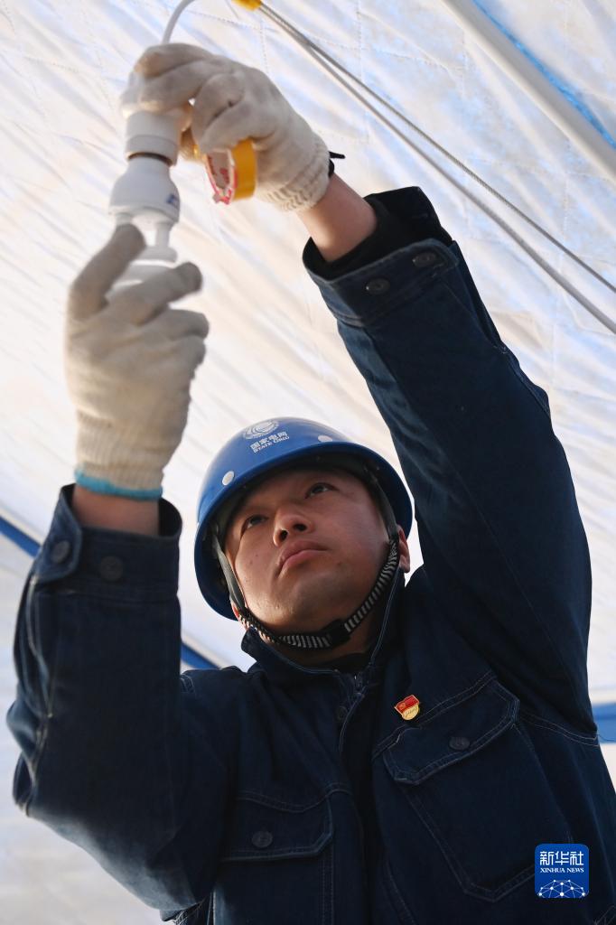 12月22日,在积石山县大河家镇康吊村,国网甘肃省电力公司武威供电公司职工为安置点新增帐篷接电。