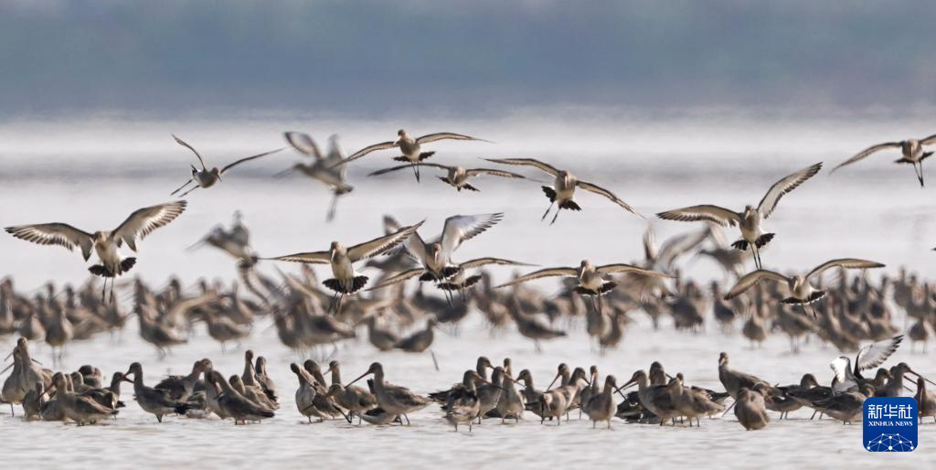 在江西省南昌市,一群黑尾塍鹬在鄱阳湖畔的五星白鹤保护小区上空飞翔(2023年3月10日摄)。新华社记者 周密 摄
