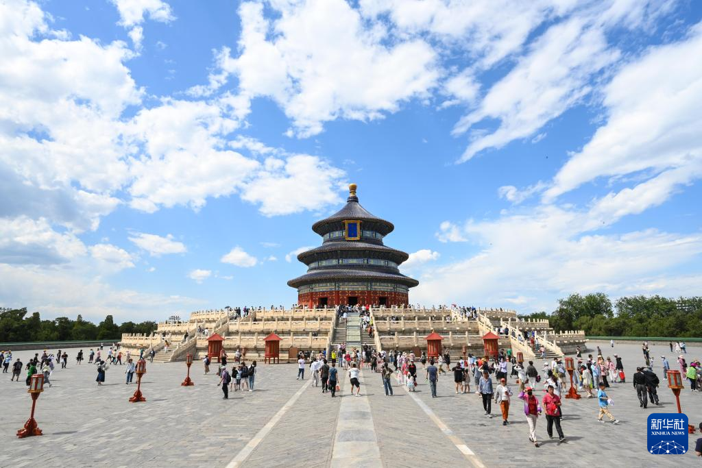 游客在蓝天白云下的北京天坛祈年殿游览(2023年6月9日摄)。新华社记者 陈晔华 摄