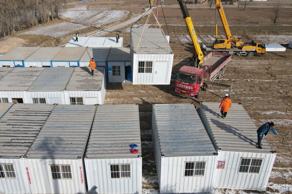12月21日,在积石山县大河家镇梅坡村,施工人员搭建活动板房(无人机照片)。新华社记者 范培珅 摄