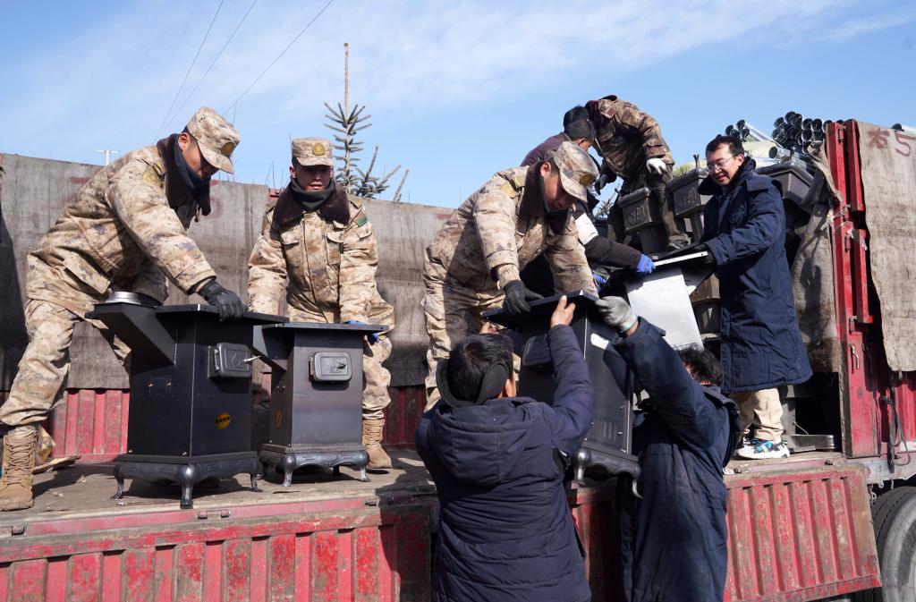 12月21日,陆军第76集团军某旅官兵在积石山县石塬镇安置点与受灾群众一起卸载取暖炉。新华社记者 张永进 摄