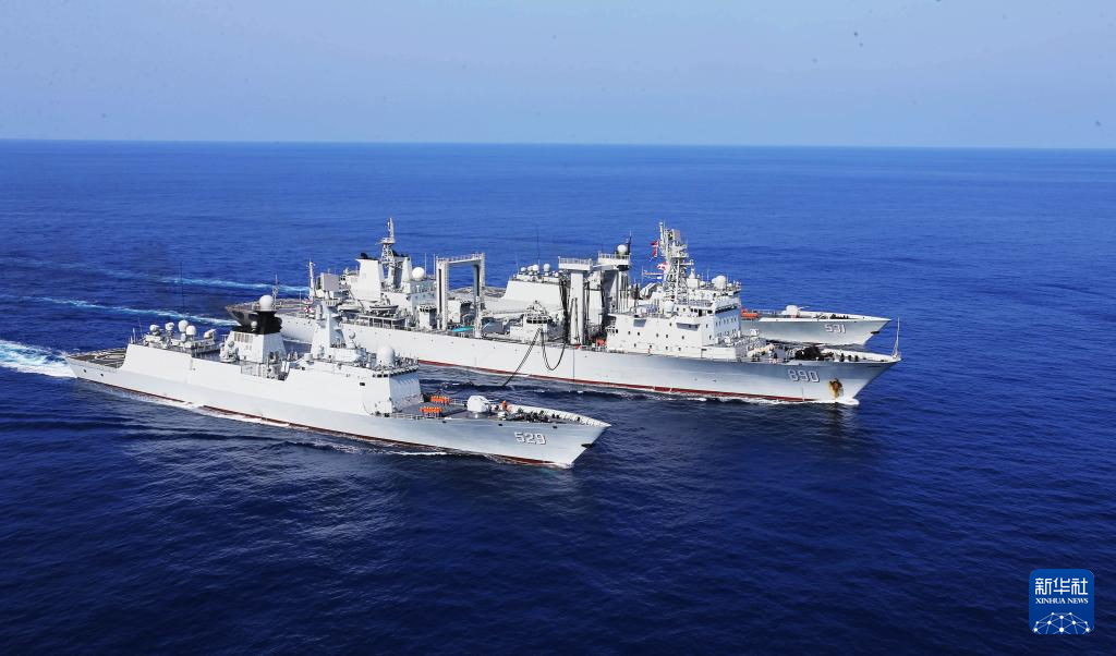 中国海军第45批护航编队乌鲁木齐舰、东平湖舰为中国渔船护航(2023年10月20日摄)。新华社发(王远方摄)