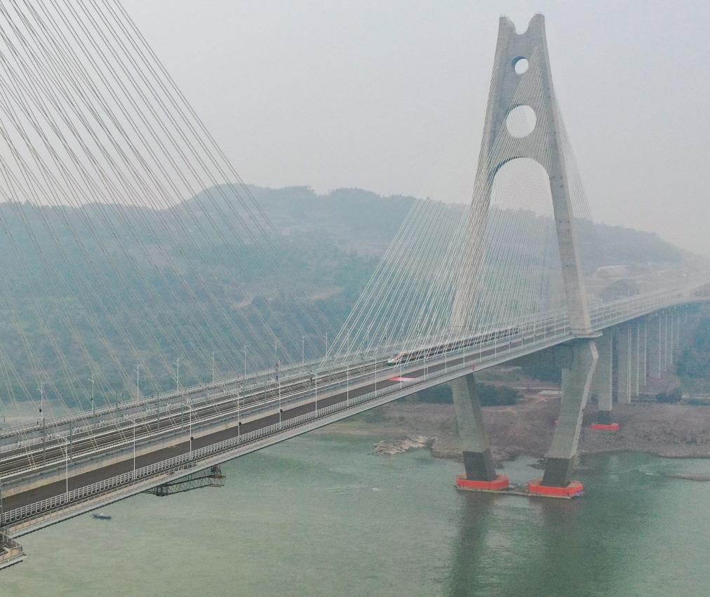 12月26日,一列复兴号动车组行驶在成自宜高铁宜宾临港公铁两用长江大桥上。新华社记者 王曦 摄