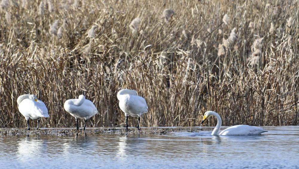 图为天鹅在密云水库流域太师屯小南河内休憩。 新华社记者 李欣 摄