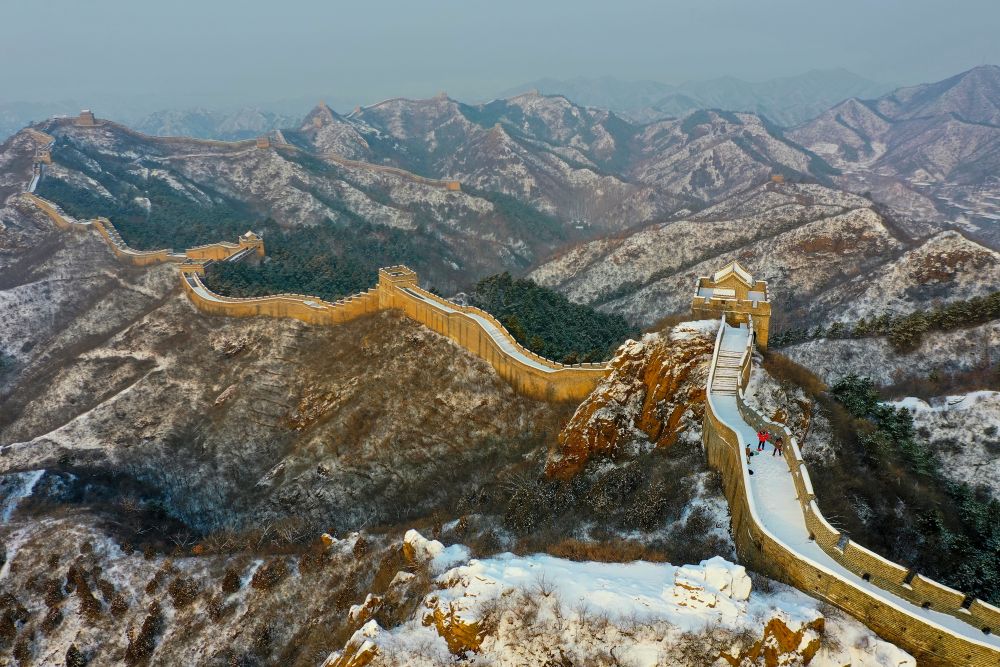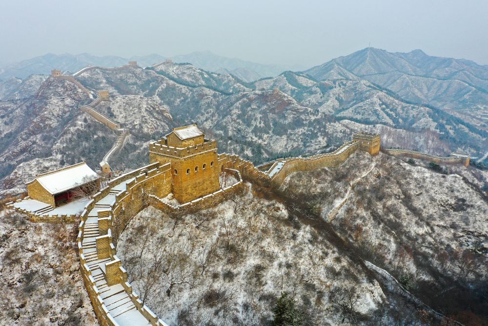 雪后的金山岭长城(1月13日摄,无人机照片)。