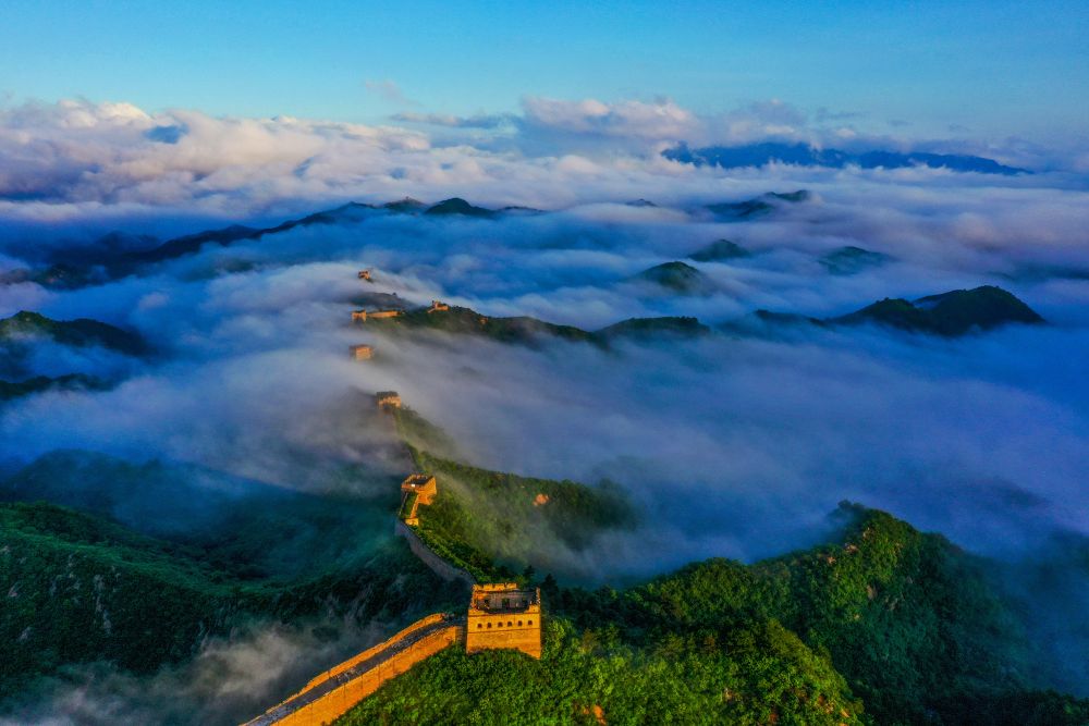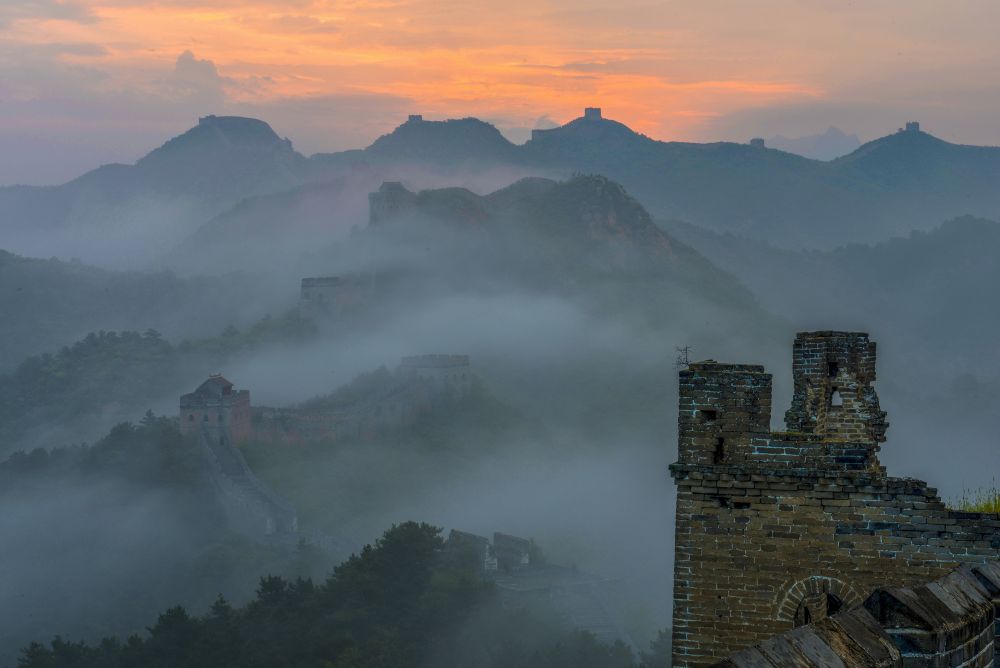 金山岭长城的夏天充满生机,树木葱郁,凉风习习。降雨过后,金山岭长城的温度和湿度有一定几率形成云海。在一个雨后的清晨,天蒙蒙亮,我站在家门口,看到山谷里的水蒸气化作雾气向空中升起。我背起相机,在天空刚刚露出鱼肚白时到达合适的拍摄位置。古朴的金山岭长城在碧绿的山间若隐若现,像一条巨龙横卧在崇山峻岭之上。云海翻腾,在金山岭长城与山间游动,蔚为壮观。