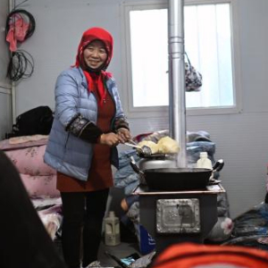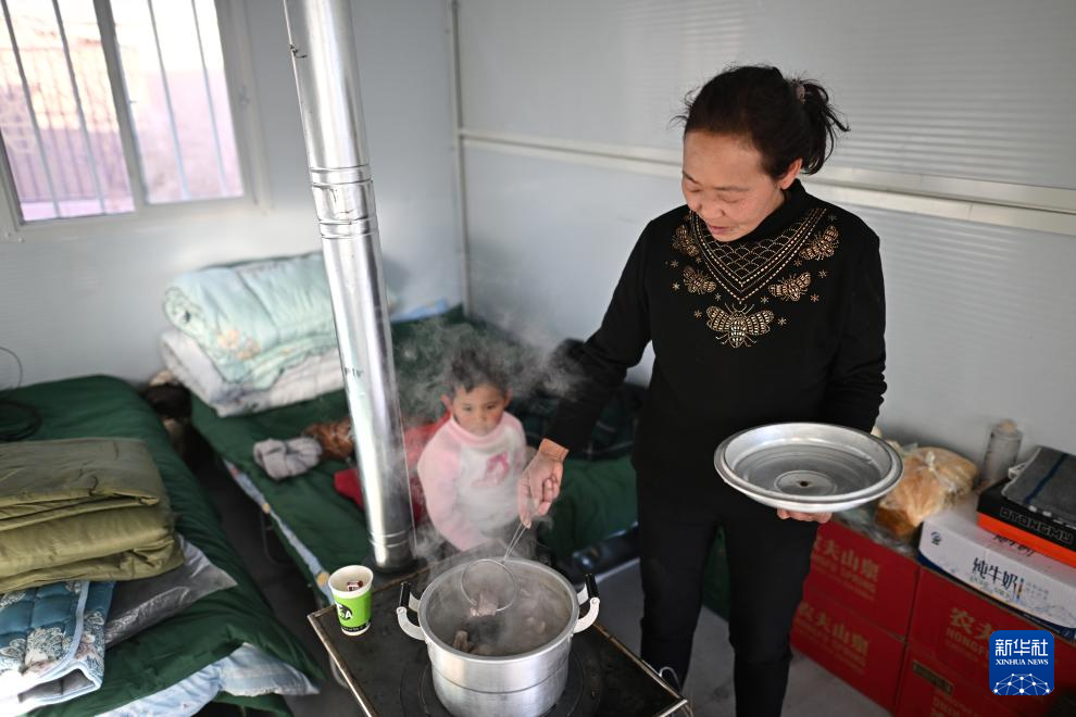 在青海民和县中川乡金田村临时安置点,金田村村民赵雪萍在板房内为家人准备晚餐(12月26日摄)。新华社记者 张宏祥 摄