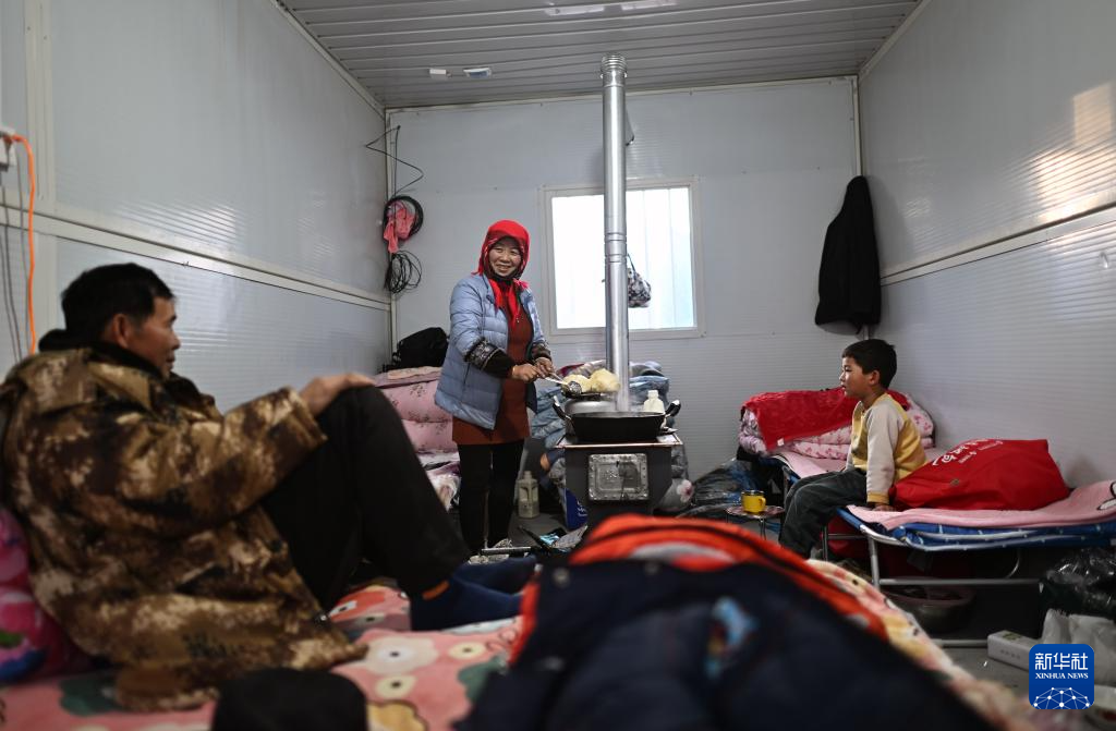 在青海民和县中川乡金田村临时安置点,金田村村民祁芝兰(中)在板房内为家人准备晚餐(12月26日摄)。新华社记者 张宏祥 摄