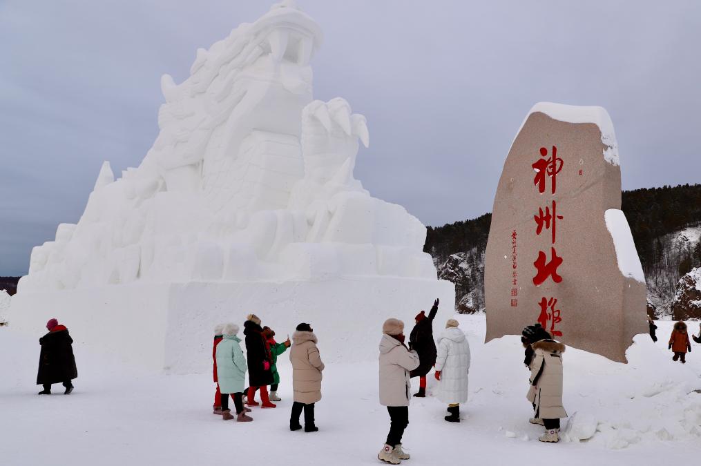 游客在漠河市北极镇北极村游玩拍照。新华社记者 徐凯鑫 摄