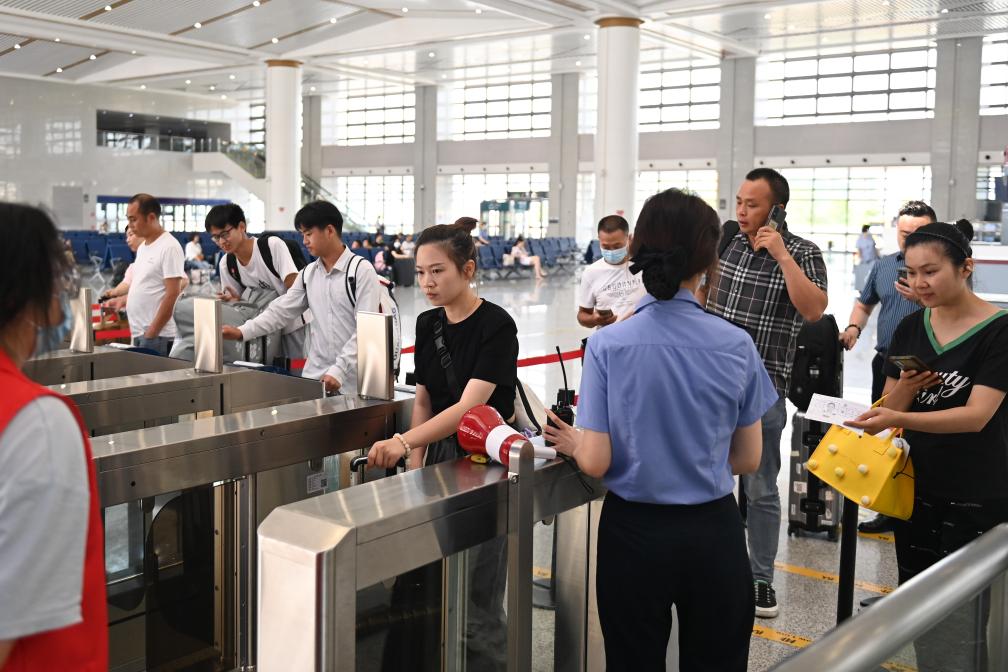 截至2023年6月19日,我国首条民营控股高铁——杭台高铁运送旅客超千万人次。图为旅客在浙江嵊州新昌站验票登车。新华社记者黄宗治 摄