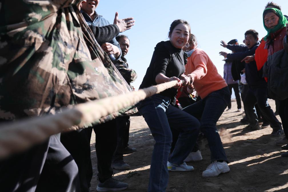 12月31日,在甘肃省临夏州积石山县石塬镇沈家坪村,村民们进行拔河比赛。(新华社记者 张睿摄)