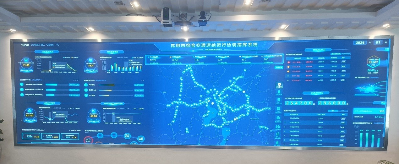 进入昆明市综合交通运输运行协调指挥中心,各类交通相关数据在大屏中一览无遗:从城市交通的公交地铁实时客流量、出租车订单数据、停车泊位占用率,到城际交通的高速公路流量、公路客运、航空运输情况……这里是掌握昆明市综合交通运行情况的最佳场所。
