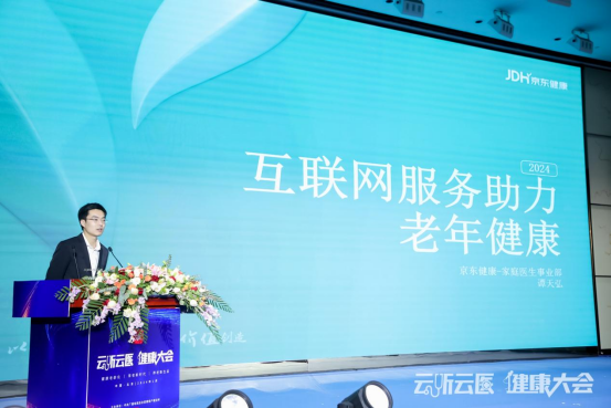 京东健康家庭医生事业部总经理谭天弘作“互联网服务助力老年健康”主题演讲,分享了“京东家医”线上线下相结合拓宽医养服务边界的经验与成果。