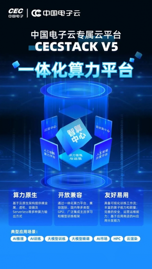 中国电子云自主研发CECSTACK V5一体化算力平台,基于先进的云原生理念设计,实现多元异构算力的统一管理和调度,为政府和行业客户提供通用计算、智能计算和高性能计算等类型的一体化算力服务。以此平台为基础面向千行百业智能化升级需求在全国各地投资建设N个可信智算中心,并携手政产学研,联合打造M个行业模型,以此为平台基础设施,通过中国电子云人工智能创新应用产业联盟,携手政企行业客户,共同培育区域人工智能产业生态,加快区域新质生产力形成,推动人工智能与实体产业深度融合,赋能数字经济高质量发展。