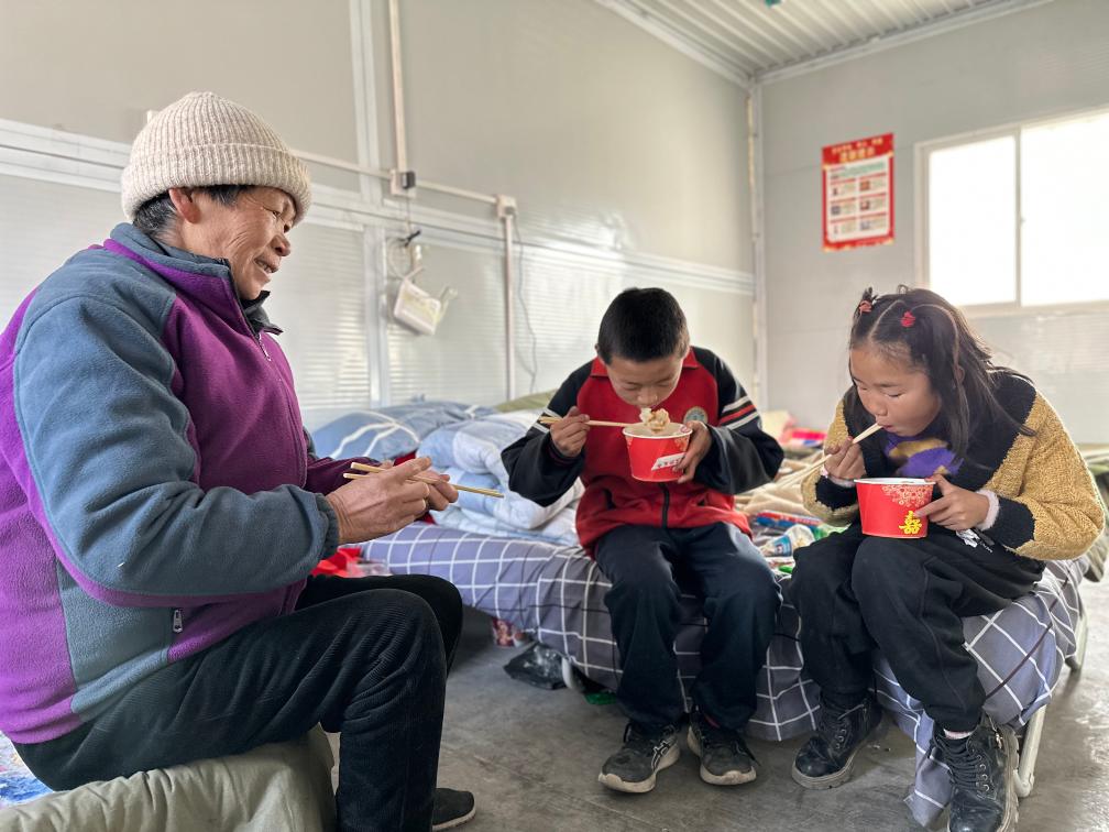 1月1日,在青海省海东市民和回族土族自治县中川乡草滩村安置点,村民在板房内吃饺子。新华社记者 张子琪 摄