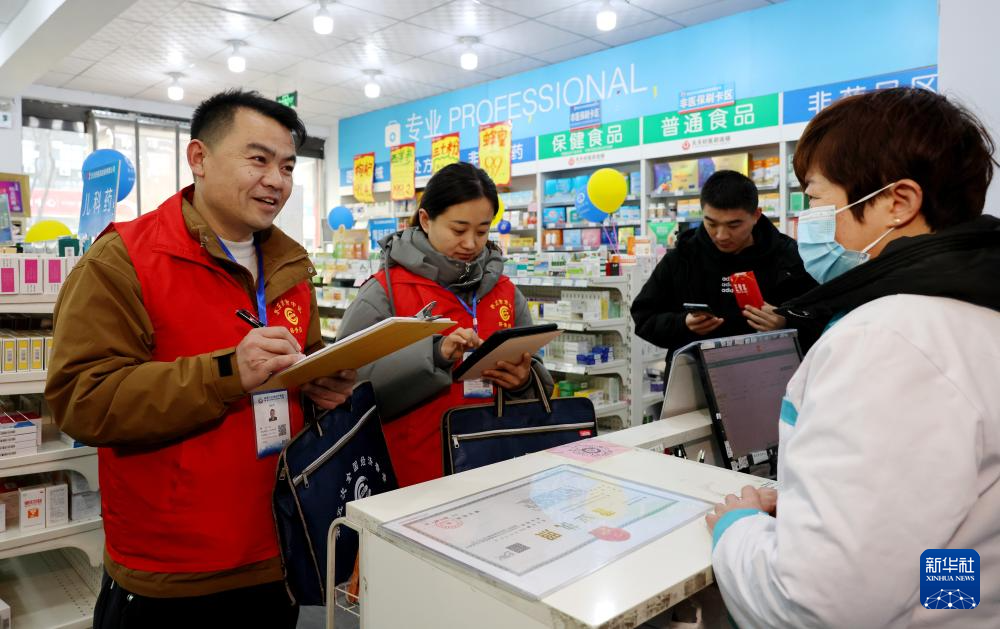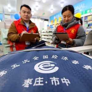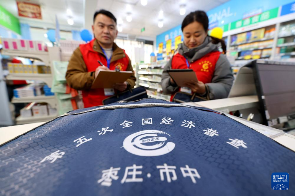 1月1日,山东省枣庄市市中区光明路街道普查员在一家连锁药店登记普查信息。新华社发(孙中喆 摄)