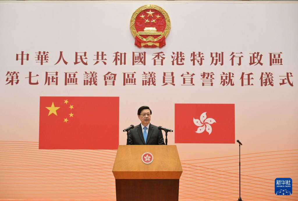 1月1日,香港特区行政长官李家超在第七届区议会区议员宣誓就任仪式上致辞。新华社发