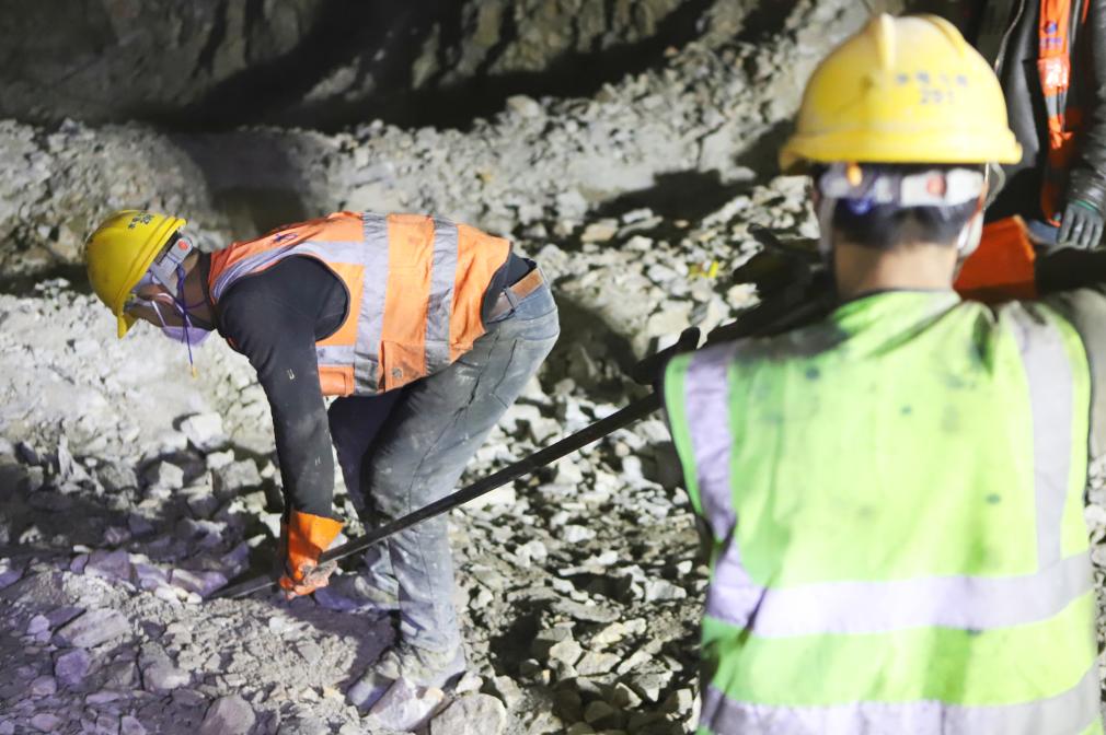 工人在引水隧洞内钻孔,准备爆破。新华社记者关明辉 摄