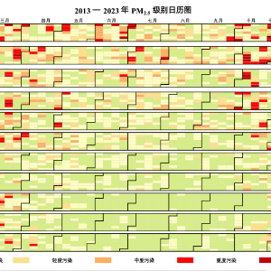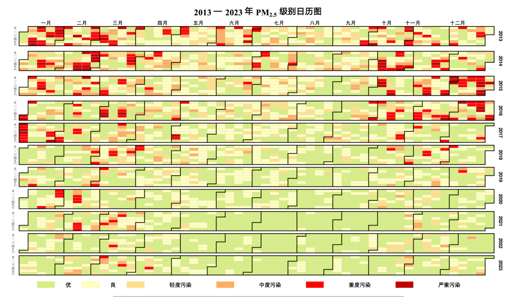 2013-2023年北京市PM2.5级别日历图,北京市生态环境局供图。