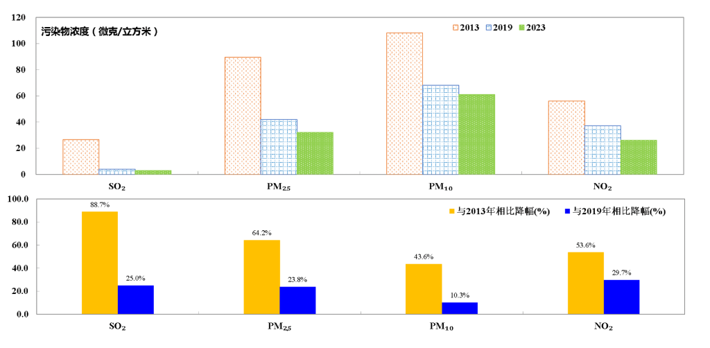 2013、2019、2023年北京大气四项主要污染物年均浓度变化,北京市生态环境局供图。