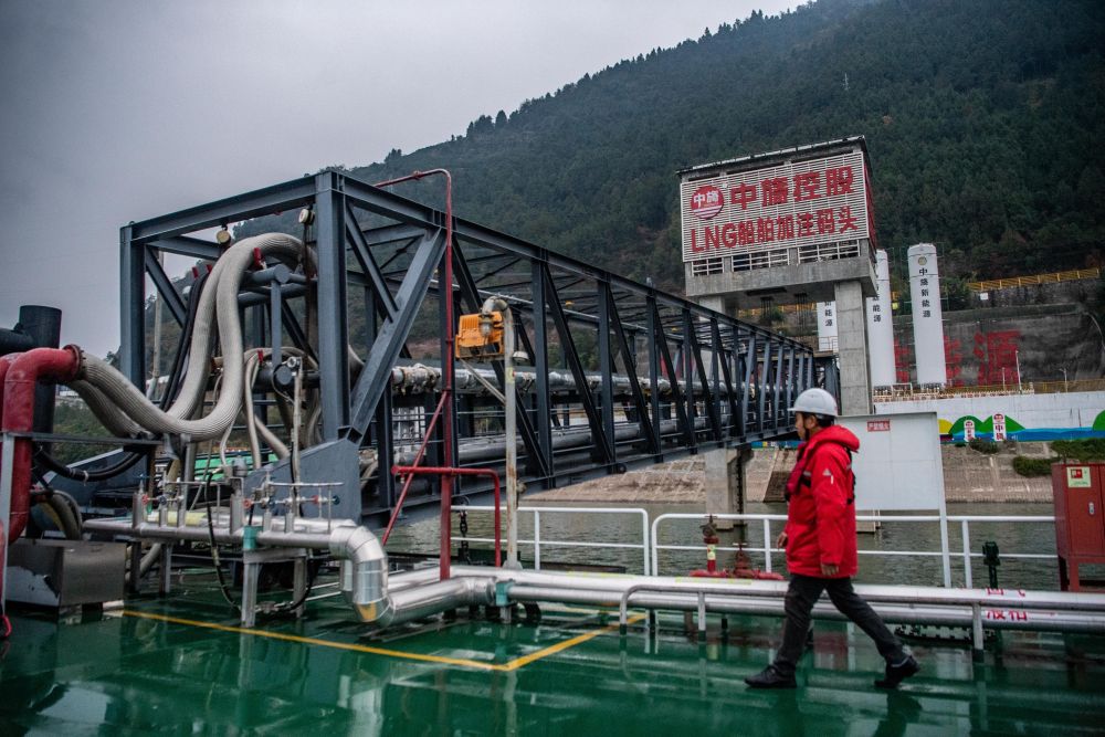 行至屈原庙村,一座现代化的LNG加气站平卧在近岸水面上。为了给日益增多的LNG新能源船提供支持,民营企业中旖新能源公司投资1.3亿元建设了这座三峡库区唯一的船舶加气站,每年可为来往船舶加气3.1万吨,为三峡库区减排二氧化碳6560吨。