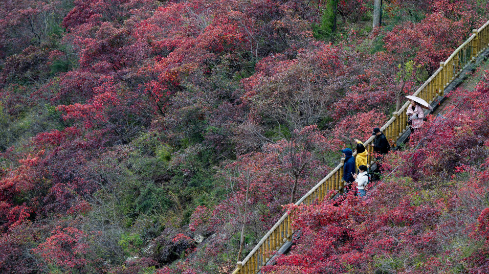 驱车行至巫山县巫峡长江大桥,眺望峡口的文峰景区,只见成团成簇的红叶,扎根在如刀削斧砍般的峭壁上,迎风挺立,从江面一直“披挂”到峰顶。来自天南海北的游客,被这大美景象吸引,不惧山路险峻,攀行在红叶掩映的步道上,时而驻足留影,时而惊叹连连。