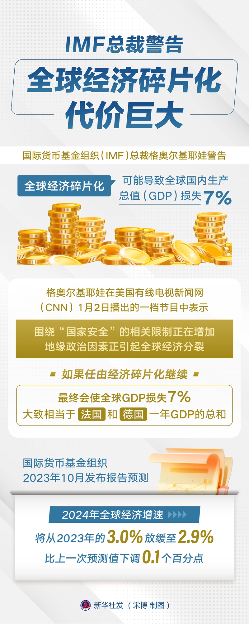 新华社华盛顿1月2日电(记者熊茂伶)国际货币基金组织(IMF)总裁格奥尔基耶娃警告,全球经济碎片化可能导致全球国内生产总值(GDP)损失7%。