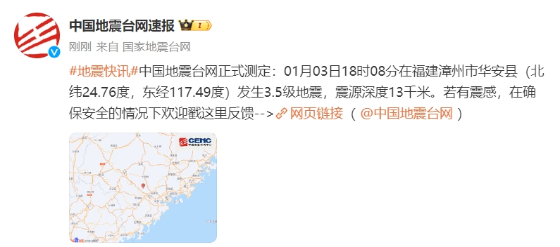 中国地震台网正式测定:01月03日18时08分在福建漳州市华安县(北纬24.76度,东经117.49度)发生3.5级地震,震源深度13千米。