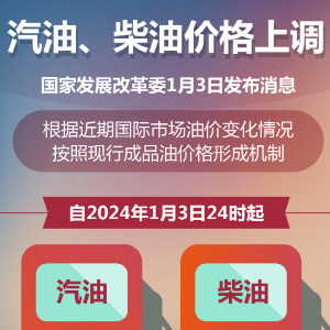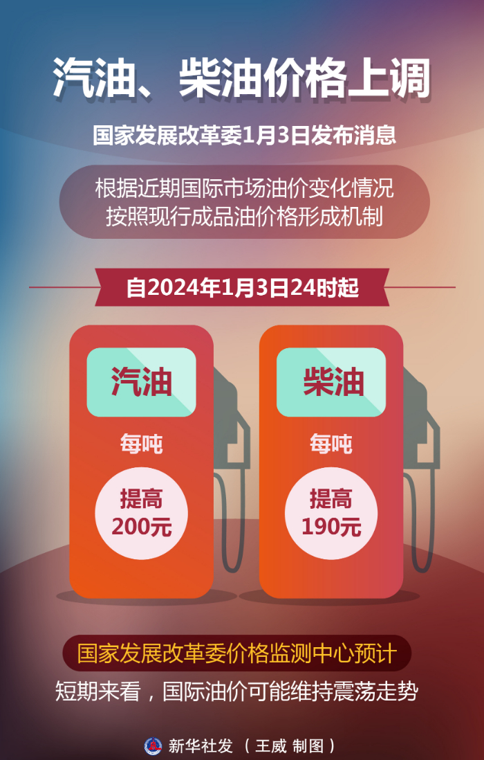 新华社北京1月3日电(严赋憬、姜子琳)国家发展改革委3日发布消息,根据近期国际市场油价变化情况,按照现行成品油价格形成机制,自2024年1月3日24时起,国内汽、柴油价格每吨分别提高200元、190元。