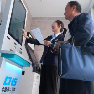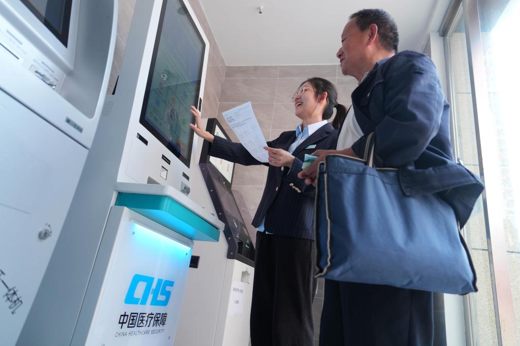 2023年11月1日,在重庆市北碚区歇马街道医保政务服务分中心,工作人员指导居民使用医保自助服务一体机查询信息。 新华社发