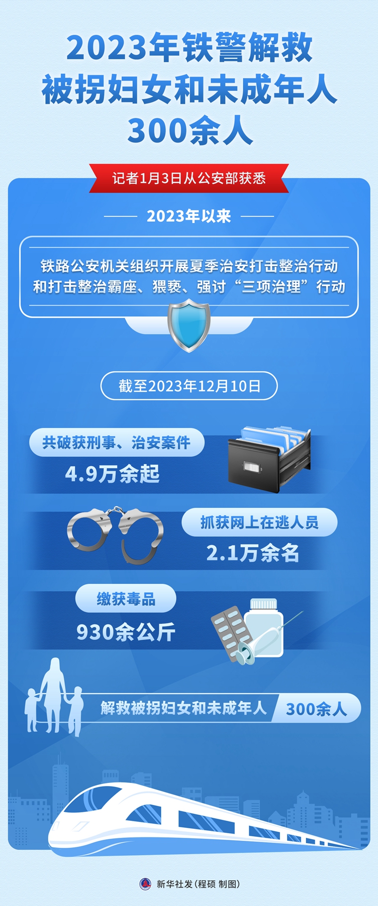 新华社北京1月3日电(记者任沁沁、熊丰)记者3日从公安部获悉,2023年以来,铁路公安机关组织开展夏季治安打击整治行动和打击整治霸座、猥亵、强讨“三项治理”行动,截至2023年12月10日,共破获刑事、治安案件4.9万余起,抓获网上在逃人员2.1万余名,缴获毒品930余公斤,解救被拐妇女和未成年人300余人。