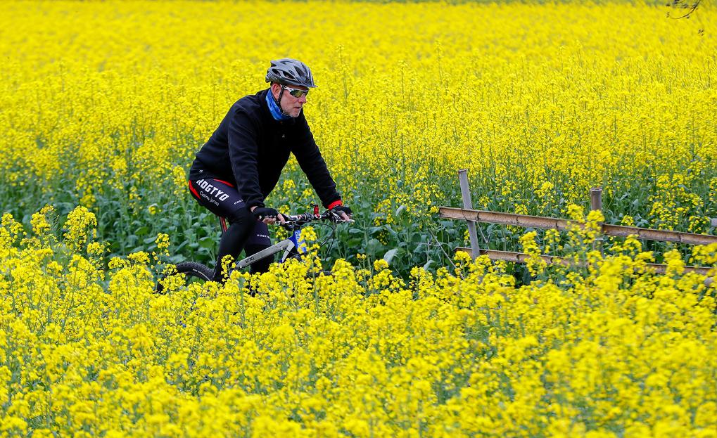 2023年3月23日,阿明在黟县油菜花田间的道路上骑行。