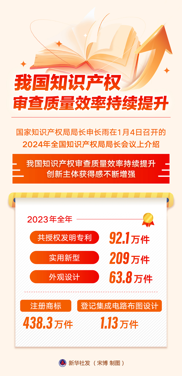 新华社北京1月4日电(记者宋晨)国家知识产权局局长申长雨在4日召开的2024年全国知识产权局局长会议上介绍,我国知识产权审查质量效率持续提升,创新主体获得感不断增强。2023年全年共授权发明专利92.1万件、实用新型209万件、外观设计63.8万件,注册商标438.3万件,登记集成电路布图设计1.13万件。