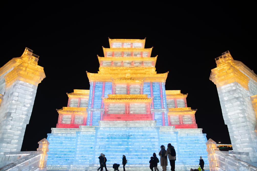 游客在哈尔滨冰雪大世界园区内游玩(1月1日摄)。
