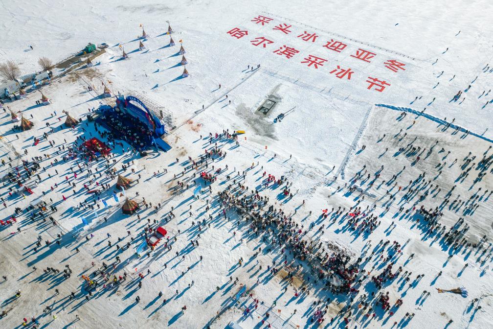 游客和市民在哈尔滨采冰节现场游玩(2023年12月7日摄)。